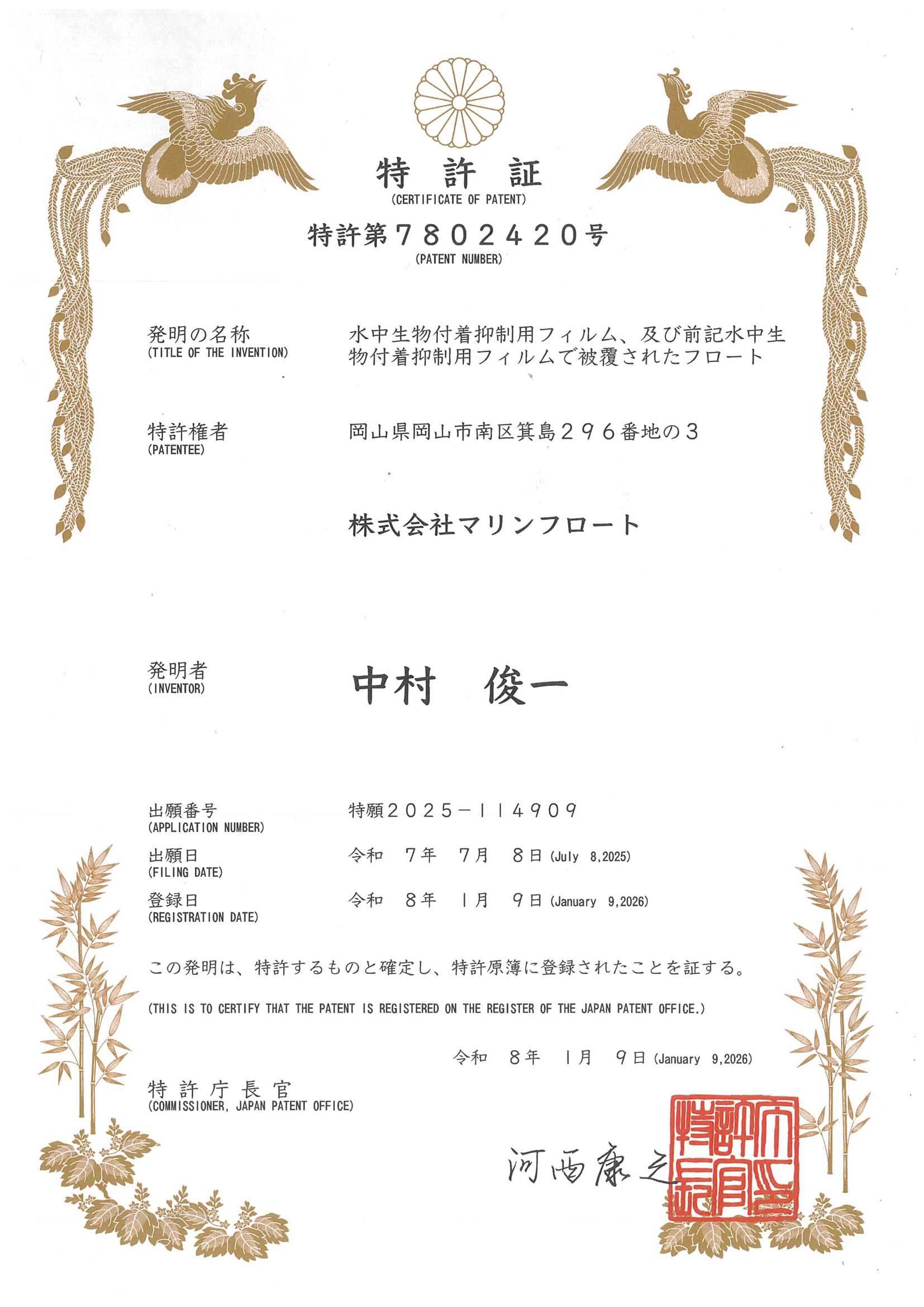 特許を取得致しました。 フロートの表面に特殊フィルムを巻くことで、海水の吸収率を抑え、フジツボ、カニなどの海洋生物の侵入を抑制することができます。 また、紫外線による劣化を防止する効果があります。 オプション機能として、管理用ICチップを埋め込むことにより万が一フロートが流された場合でも リーダーで読み取ることで自分のフロートを判別できます。(使用年数なども判別可能)